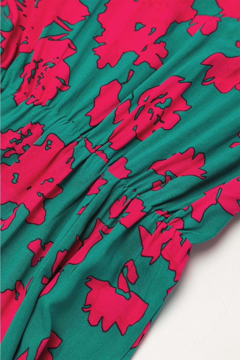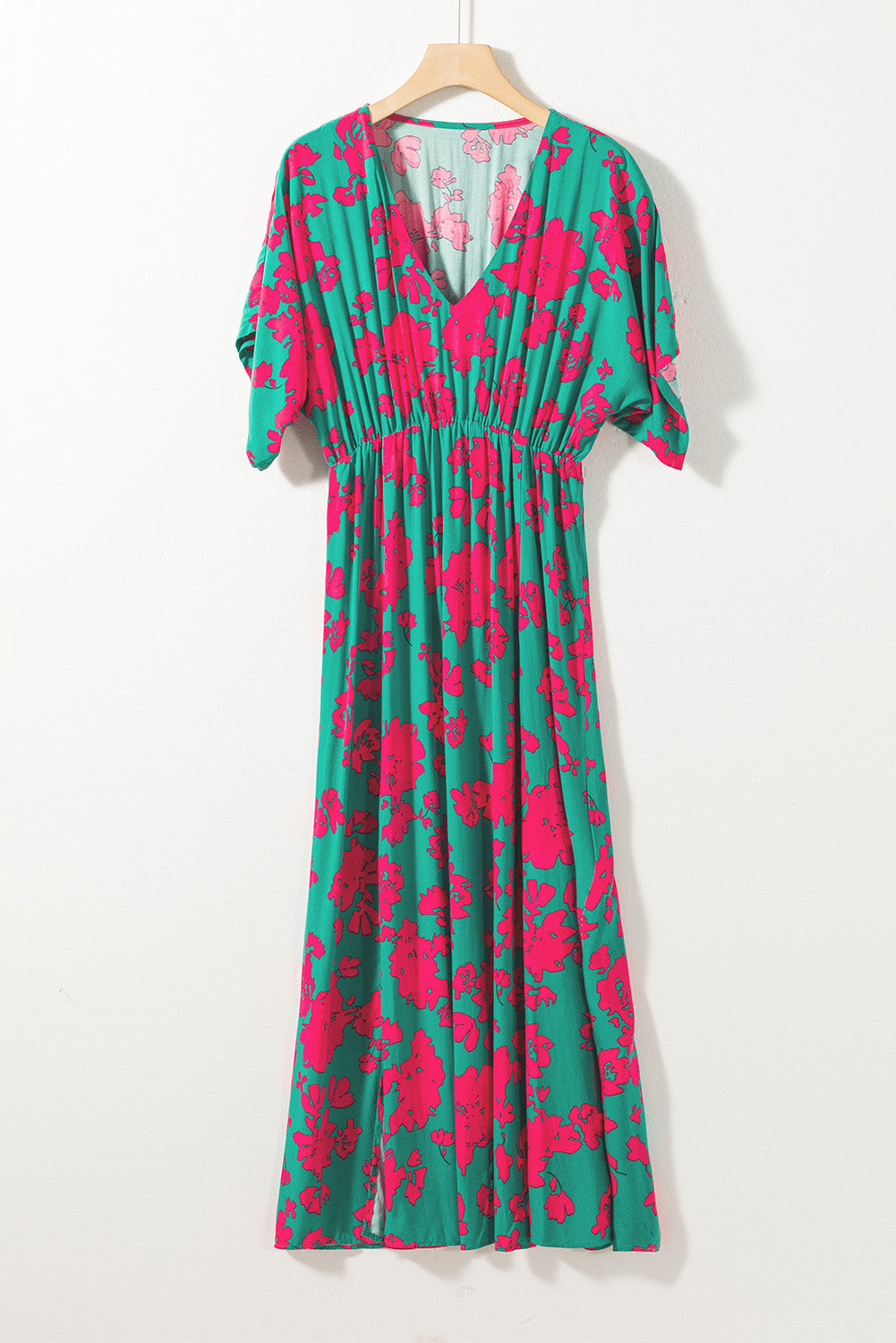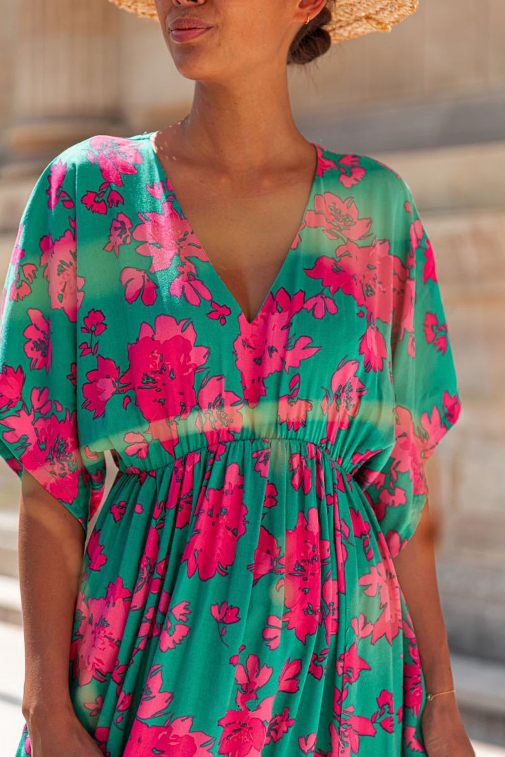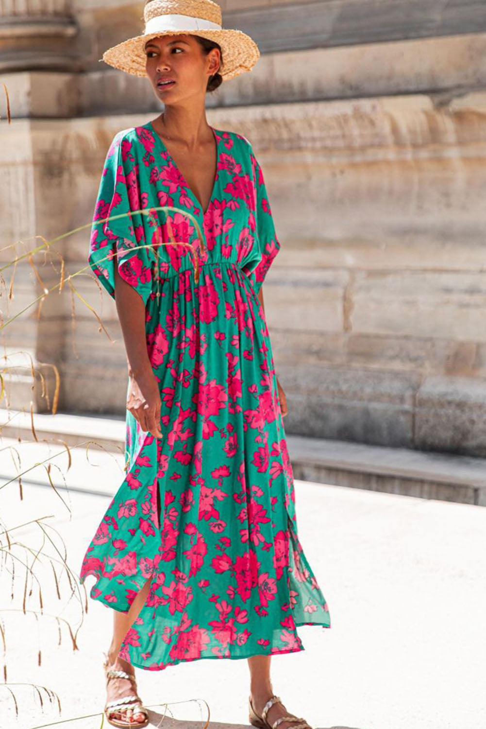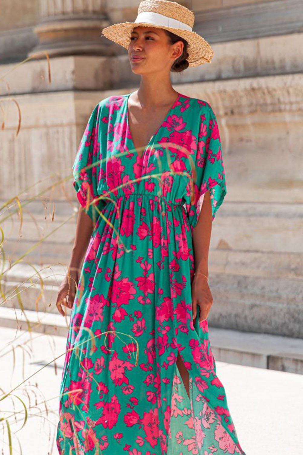 - A chic summer dress for the stylish Boheme! This flowery maxi dress has various embellishments to elevate its appearance. It features a flattering v-neck and flirty sleeves for an elegant touch. Made of a lightweight, breezy fabric with slits at the hemline.