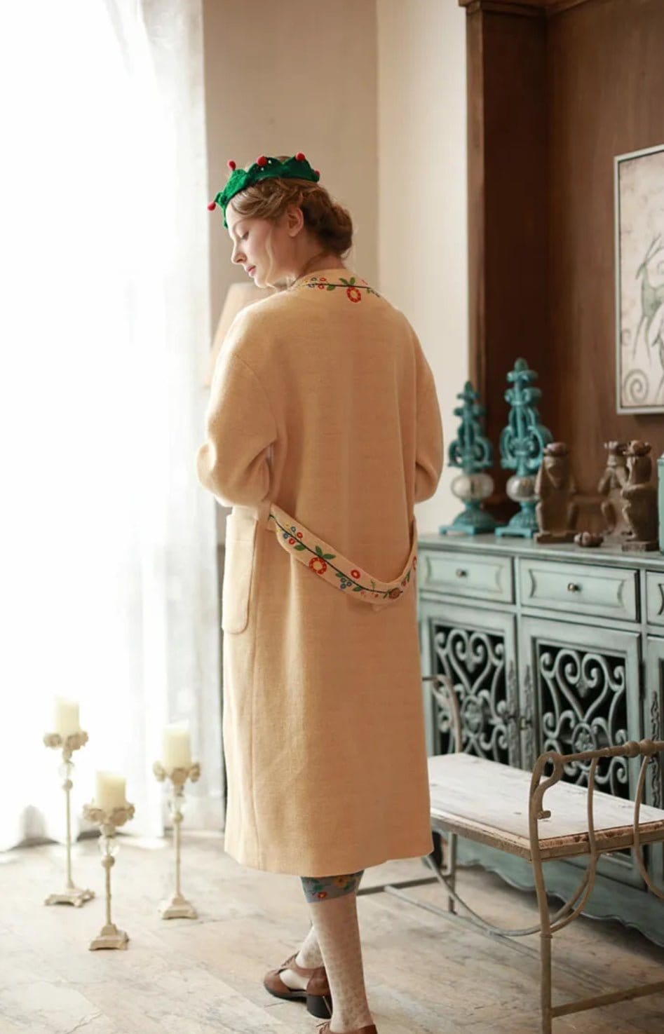 Let Autumn's Wind take you into the season in style - introducing the one-of-a-kind sweater coat handmade from wool. Feel snug and warm as you wrap yourself in luxury and wearable art. Make every autumn special with a unique, embroidered floral coat!